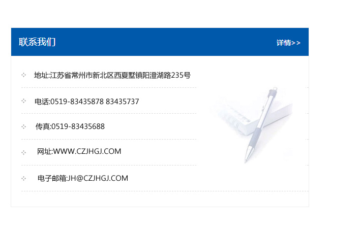 地址:常州市新北區友邦商務大廈1幢16、17層  電話:0519-85101652  傳真:0519-85112595  郵編:213022  網址:www.www_zzddgz_com.chinahaichi.com  郵箱:xiajifengaa@163.com